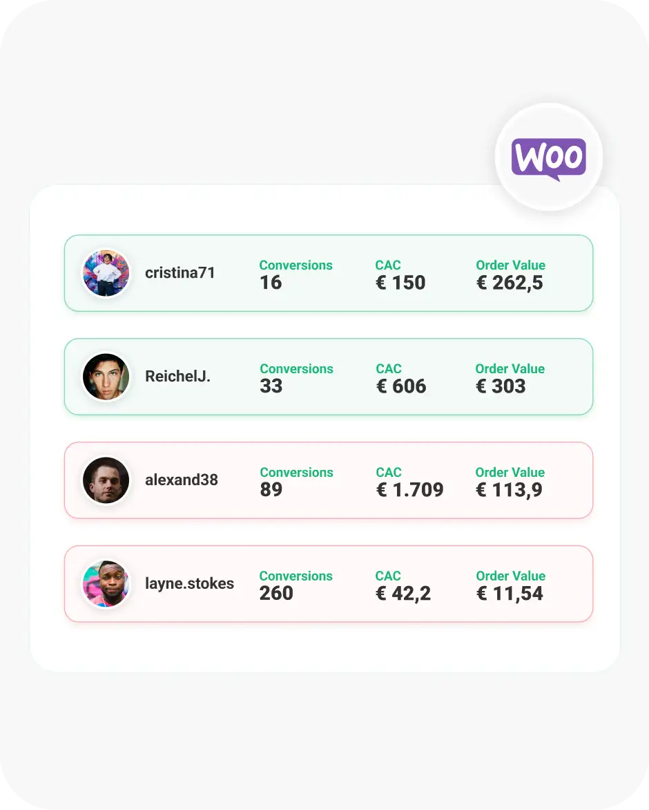 Sieh sofort, welche Creator wirklich Verkäufe in deinem WooCommerce-Shop bringen - vom ersten Klick bis zum finalen Checkout.